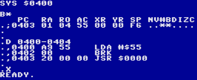 The built-in machine language monitor can be started with the MON BASIC command. It is based on the monitor of the Final Cartridge III and supports most of its features.