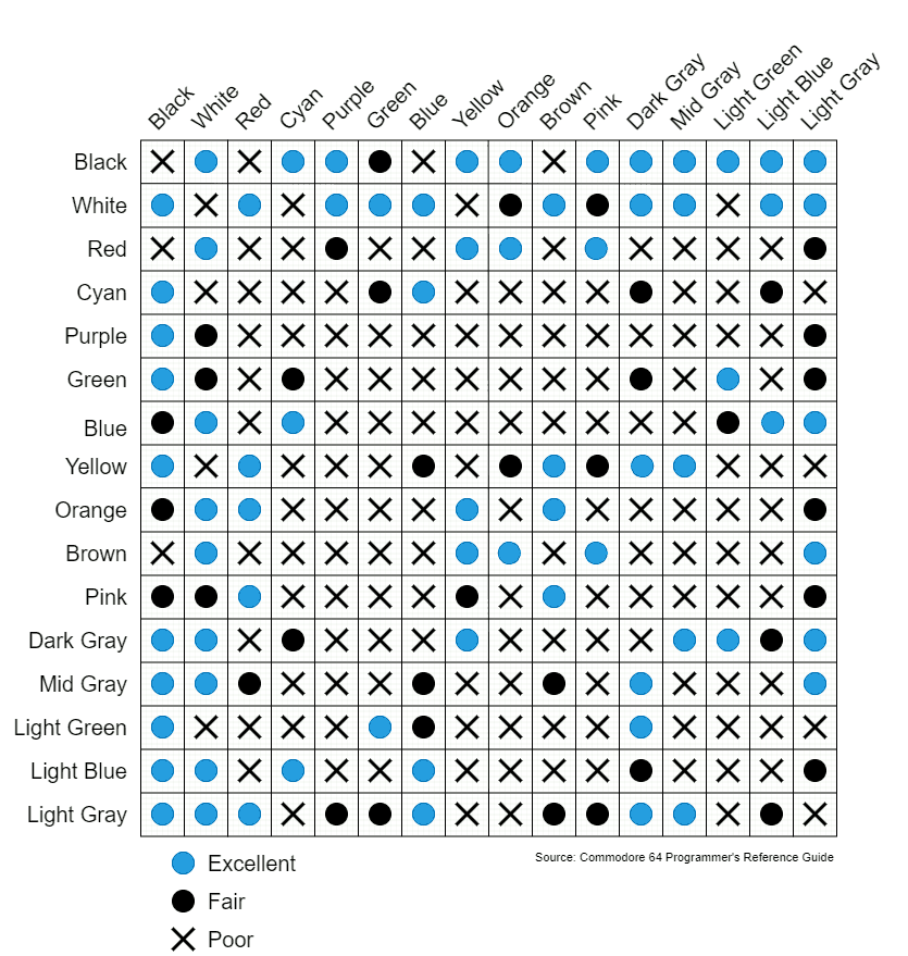 CRT Televisions and composite monitors experience color bleeding when certain colors are placed next to each other. Color bleed is especially apparent when choosing text color against certain background colors. Sprite pixel colors, character colors, and tiles will require careful color choice for better contrast. This chart shows which color combinations to avoid, and which work especially well together.